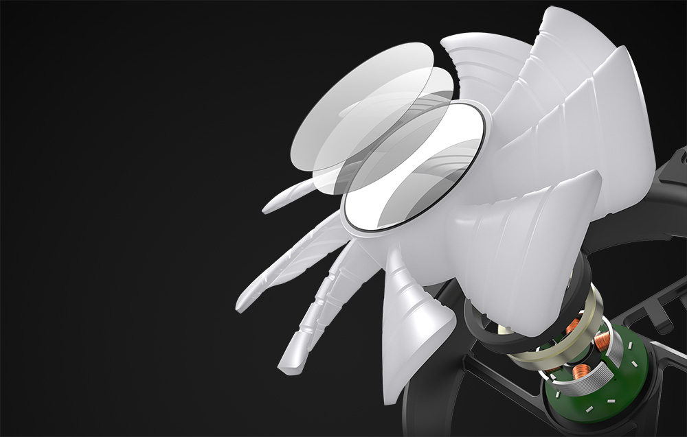 Ventilatorji so bili zasnovani s pozornostjo do vsake podrobnosti. Visokokakovostne ležaje Rifle odlikuje življenjska doba do 30.000 ur. Kar 9 lopatic z gladko površino zagotavlja zanesljivo hlajenje, gumijasta tesnila pa zmanjšujejo vibracije in poskrbijo za tiho delovanje ventilatorjev.