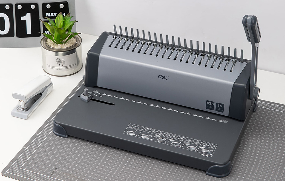 Stroj za vezavo Deli E3872 omogoča vezavo listov papirja do velikosti A4. Naenkrat lahko naredi od 1 do 21 lukenj v največ 15 listov papirja. Z njim lahko povežete do 425 listov papirja. Poleg tega je opremljen s posebno posodo za odpadke in je izjemno enostaven za uporabo.